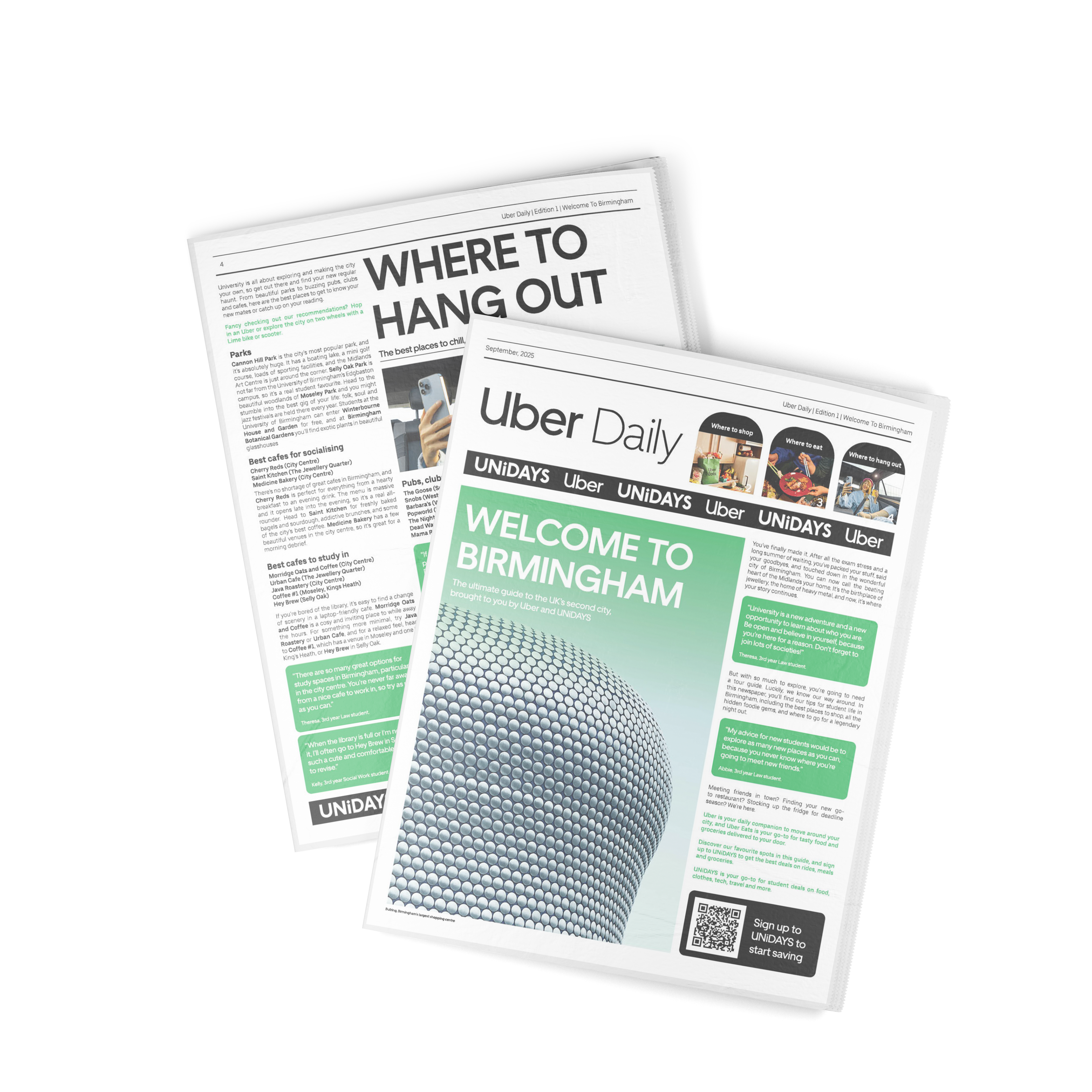 “Uber Daily” is a unique, useful handout that students would actually want to keep. Packed with tips about their new city, it encourages long term retention rather than being another flyer getting chucked in a bin.